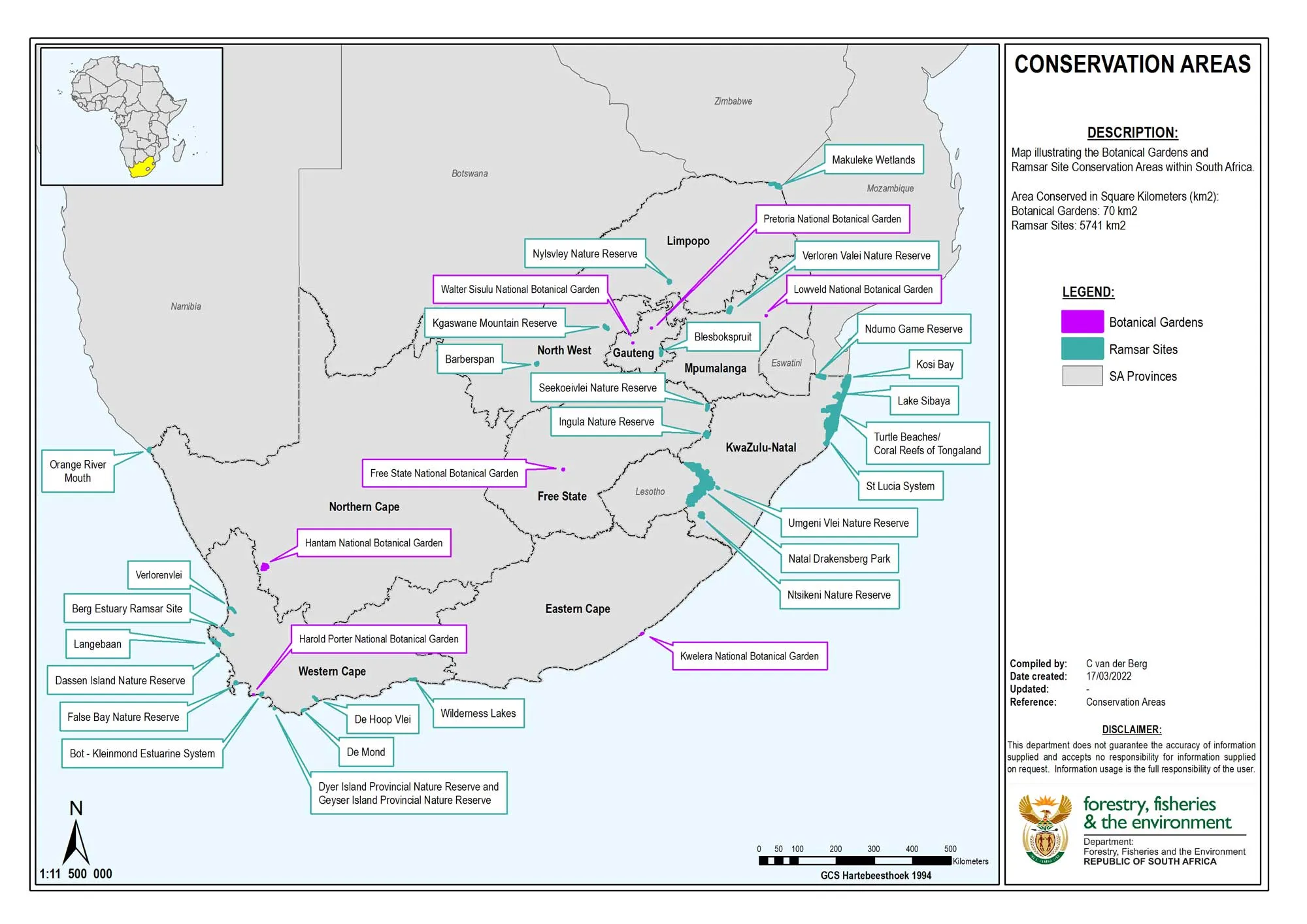 are defined as geographical areas that are formally protected by the National Environmental Management: Protected Areas Act (Act 57 of 2003). They are mainly used for biodiversity conservation and contribute to the protected area estate.