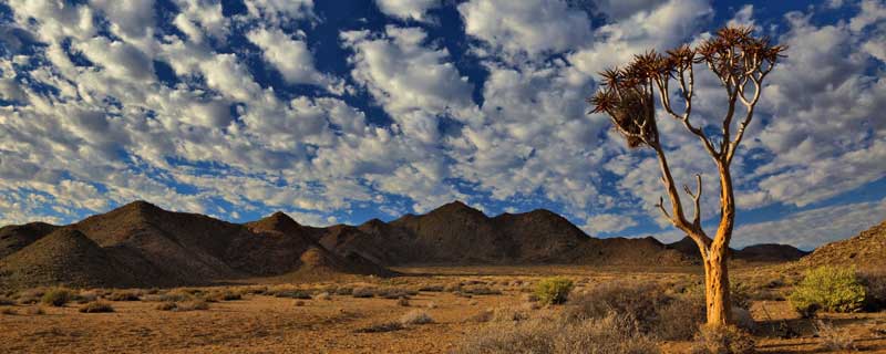 Rugged kloofs, high mountains and dramatic landscapes that sweep away inland from the Orange River divulge the fact that you are now in the vast mountain desert that is the |Ai-|Ais/Richtersveld National Park, an area managed jointly by the local Nama people and the South African National Parks. This is a harsh and unpredictable land where water is scarce and life-sustaining moisture comes in the form of early morning fog - called 'Ihuries' or 'Malmokkies' by the local people - which rolls in from the cold waters of the Atlantic Ocean, sustaining a remarkable range of small reptiles, birds and mammals. A staggering assortment of plant life, some species occurring nowhere else, is to be found here, with gnarled quiver trees, tall aloes and quaint 'half-mens' keeping vigil over this inscrutable landscape.